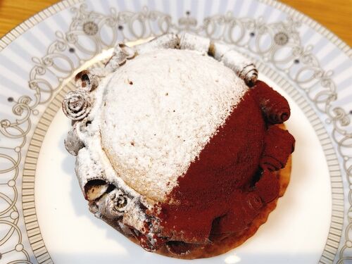 インパクトある見た目が気になりながら食べたことがなかったガトー。 「サクサクのマカロン生地で濃厚なビターチョコレートガナッシュをサンド」という説明に、大きいマカロンか〜エヴァンのマカロン好きだし美味しいといいな、チョコは周りについてるくるく…
